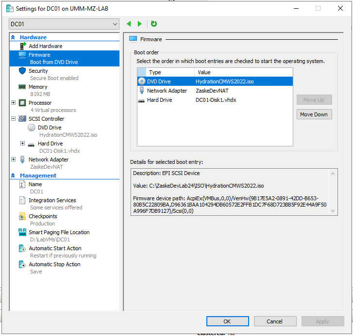 PS C:\HydrationSetup\HydrationKitWS2022-main-2024> .\New-LabVMsForHyperV.ps1 -VMNetwork ZaskeDevNAT -ISO C:\ZaskeDevLab\ISO\HydrationCMWS2022.iso -VMLocation D:\LabVMs -SelectVMs DC